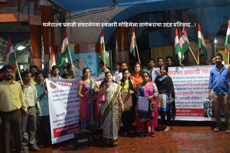 मुंबईची जीवनवाहिनी असलेल्या उपनगरीय लोकल ट्रेन्समध्ये महिलांसाठी राखीव असणा-या डब्यांची संख्या अपुरी असून, ती वाढवावी तसेच गर्दीच्या वेळेत कल्याण आणि डोंबिवलीप्रमाणे ठाणे ते सीएसटी ‘महिला विशेष’ लोकल सुरु करावी या प्रमुख मागण्यांसाठी, ‘धर्मराज्य पक्ष’प्रणित ‘धर्मराज्य प्रवासी संघटने’च्यावतीने गुरुवार, दि. २१ जुलै रोजी ठाणे रेल्वे स्थानकाबाहेर नोकरदार महिलांच्या माध्यमातून स्वाक्षरी मोहीम राबविण्यात आली होती.